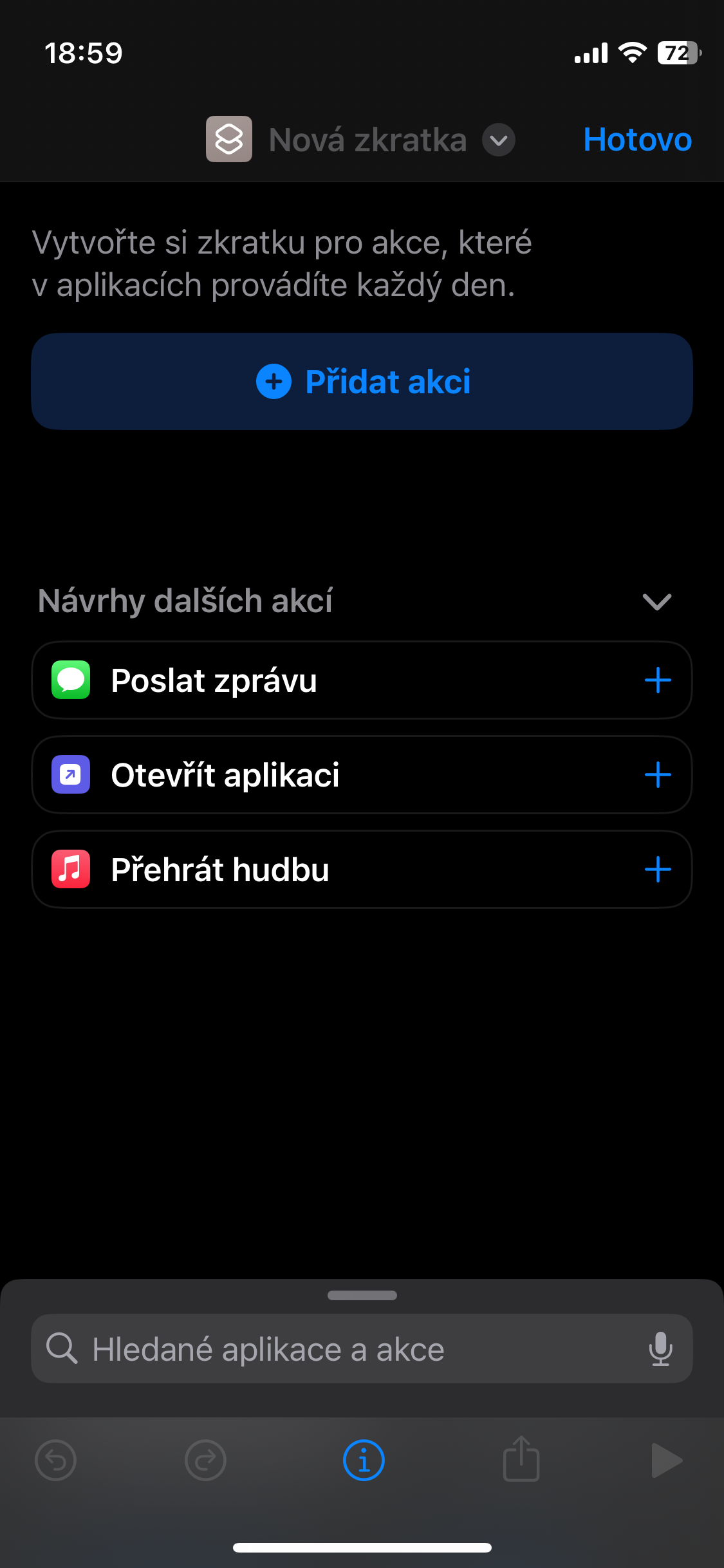- Otevřete Apple Shortcuts → Přidat zkratku přes tlačítko +.