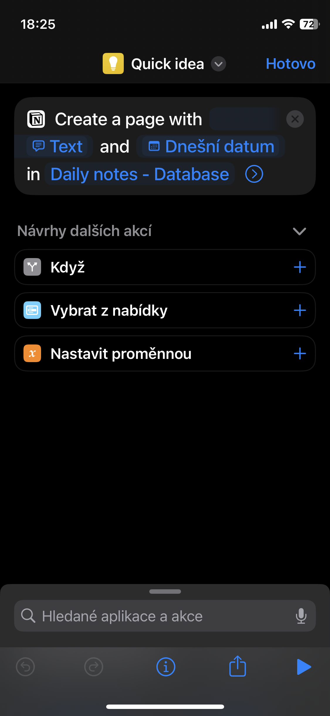 - Pojmenujte si svou zkratku. Přidat akci → Notion → Create a database page. Zvolte Vždy se dotázat a kam se má myšlenka (page) uložit do databáze v Notion. Pokud nemáte databázi, je potřeba si ji nejprve vytvořit.