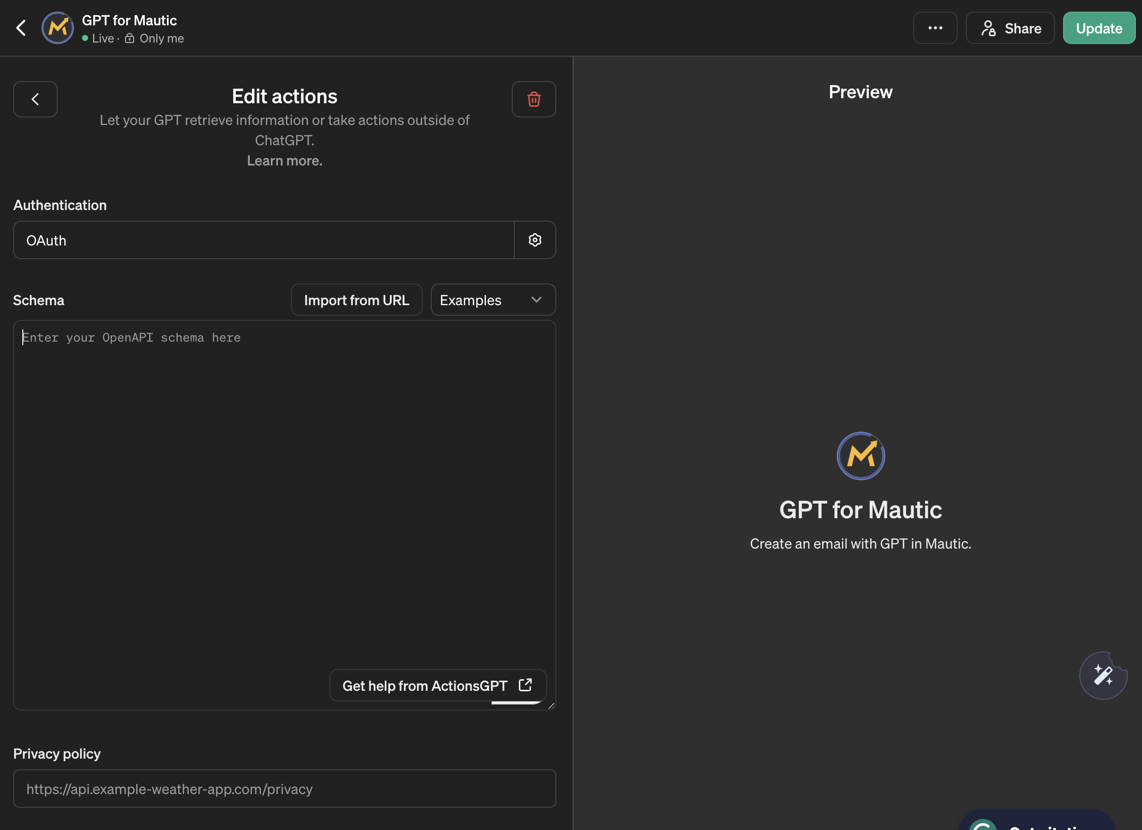 3) Save → Nyní bude potřeba vložit OpenAI API schema.