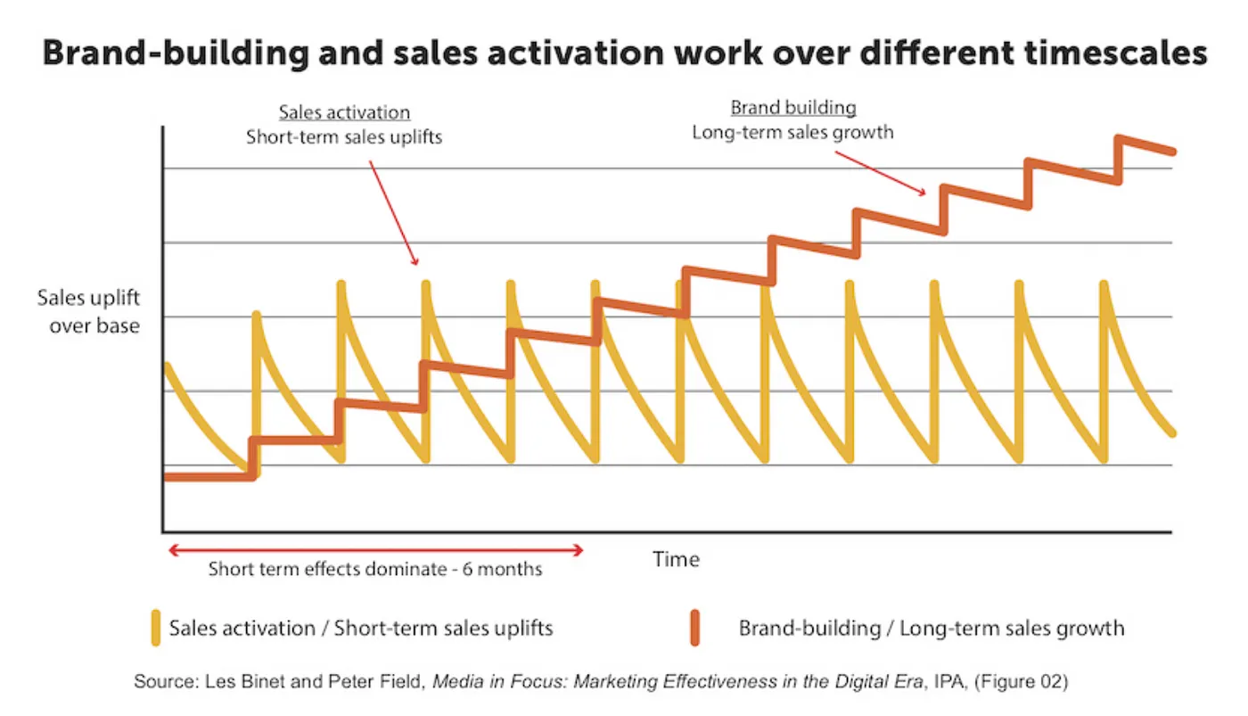 Důležitý je taky myslet na určitý poměr mezi brandovou reklamou a výkonostní reklamou. Neexistuje na to žádná poučka, nicméně jedná se o long term budování brandu a povědomí o značce. Příkladem může být Lidl, který před Vánoci pouští brandové reklamy , padá sníh a všichni se mají hezky a vesele si zpívájí, ale produkt v nedohledu. Naproti tomu performance reklama jak vyšitá, super ceny, konkrétní produkty.